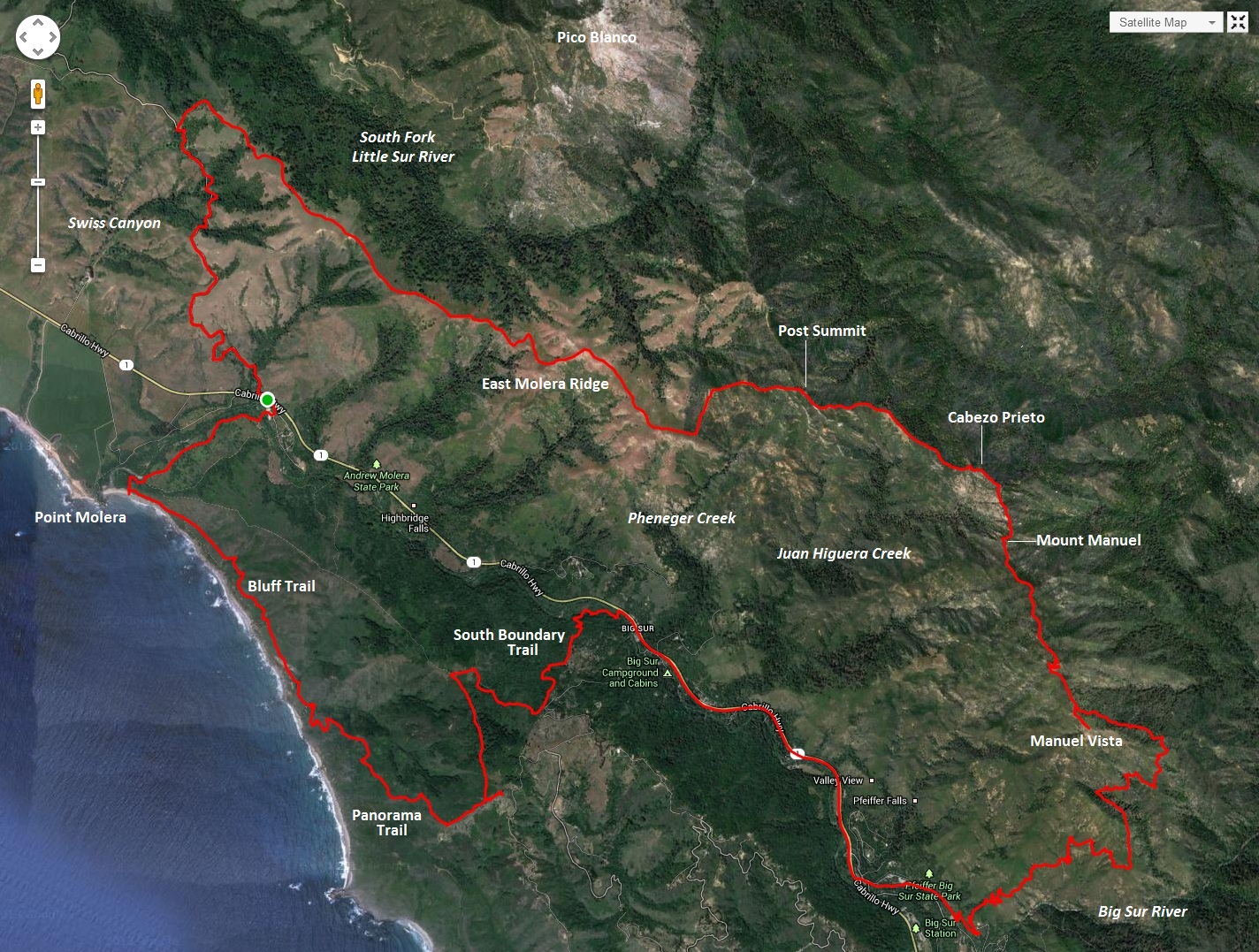 My favorite viewpoint was from a prominent knoll on the way down from Mount Manuel off slightly off the trail, a viewpoint that I call “Manuel Vista.” This point features a remarkable, unobstructed 360 degree view from Ventana Double Cone to the entire Big Sur River drainage to Point Sur. Contuing the descent off Mount Manuel the trail is in pretty rough shape in spots in the upper elevations but becomes better in the last couple miles into Pfeiffer Big Sur State Park. Descending to the valley bottom by the Big Sur River suddenly transitioned to a completely different ecosystem with redwoods instead of the parched chaparral slopes on Mount Manuel. After a break at the State Park near the Big Sur River we continued along a couple miles of road on Hwy 1 to a back entrance into Andrew Molera State Park Trails. This back entrance is a little tricky to find. Just past the River Inn is a gated bridge across the Big Sur River that contains a window for pedestrian passage. Just after the bridge, turn right onto single track for around 0.3 miles before coming to a junction. To the left is the start of the South Boundary Trail (as of January 2014 the trail sign was on the ground). The path ascends through redwoods and oak woodlands to great views of Pico Blanco, Post Summit, Cabezo Prieto and Mount Manuel. Ascending higher up on the Ridge Trail we reached the a point on Pfieffer Ridge with views into the recent devastation caused by the Pfieffer Fire (Andrew Molera State Park and its trails were not impacted by the fire). From the viewpoint, we headed down Panoramic Trail and then Bluffs Trail to Molera Beach with with some awesome afternoon light on the coast. Finishing along the coast with a cool ocean breeze served as a perfect way to finish a great run and complete the loop. Strava route here.