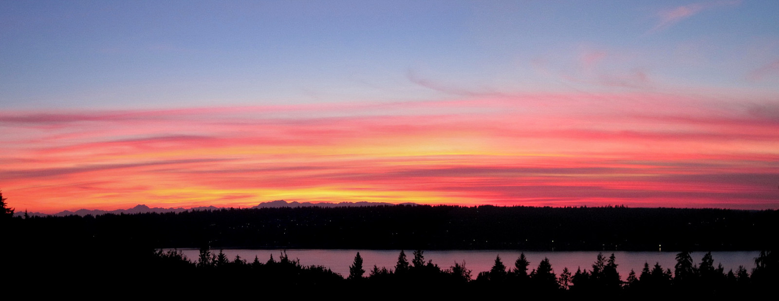 I thought the sunset from August 1st was great, but the light show on August 14th was even better! No smoke this time, just an idyllic uniform layer of high clouds producing an intricate pallete of colors – yellow, orange, pink, red, purple. Amazing! Click image for larger versions.