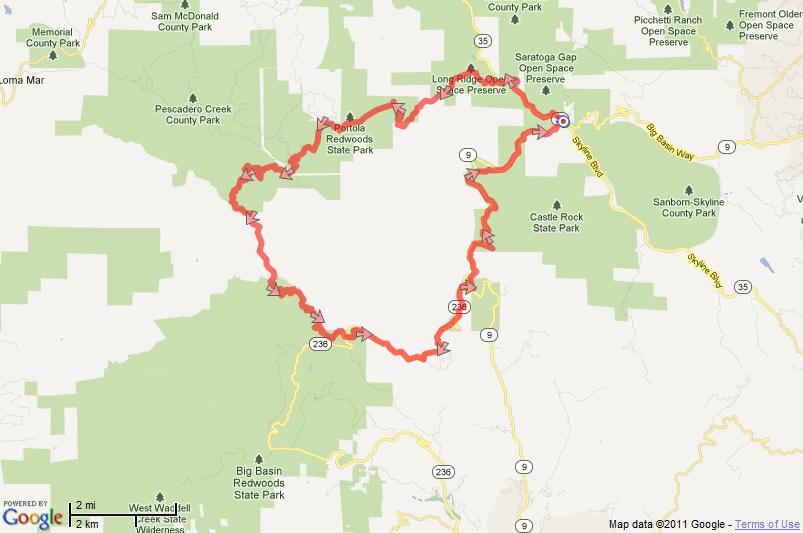 The loop around the Pescadero watershed is quintessential Santa Cruz Mountains, with all the things you expect to see in these mountains wrapped up into one pleasant loop, including spectacular vistas from grassy ridgelines, ancient douglas firs, chaparral with stately knobcone pines, and lush redwood forest. The route passes through a collection of parks and preserves, including Saratoga Gap Open Space Preserve, Long Ridge Open Space Preserve, Portola Redwoods State Park, Pescadero County Park, Big Basin State Park, and Castle Rock State Park. 99% of the loop is on trails, almost all of which are delicious single track.