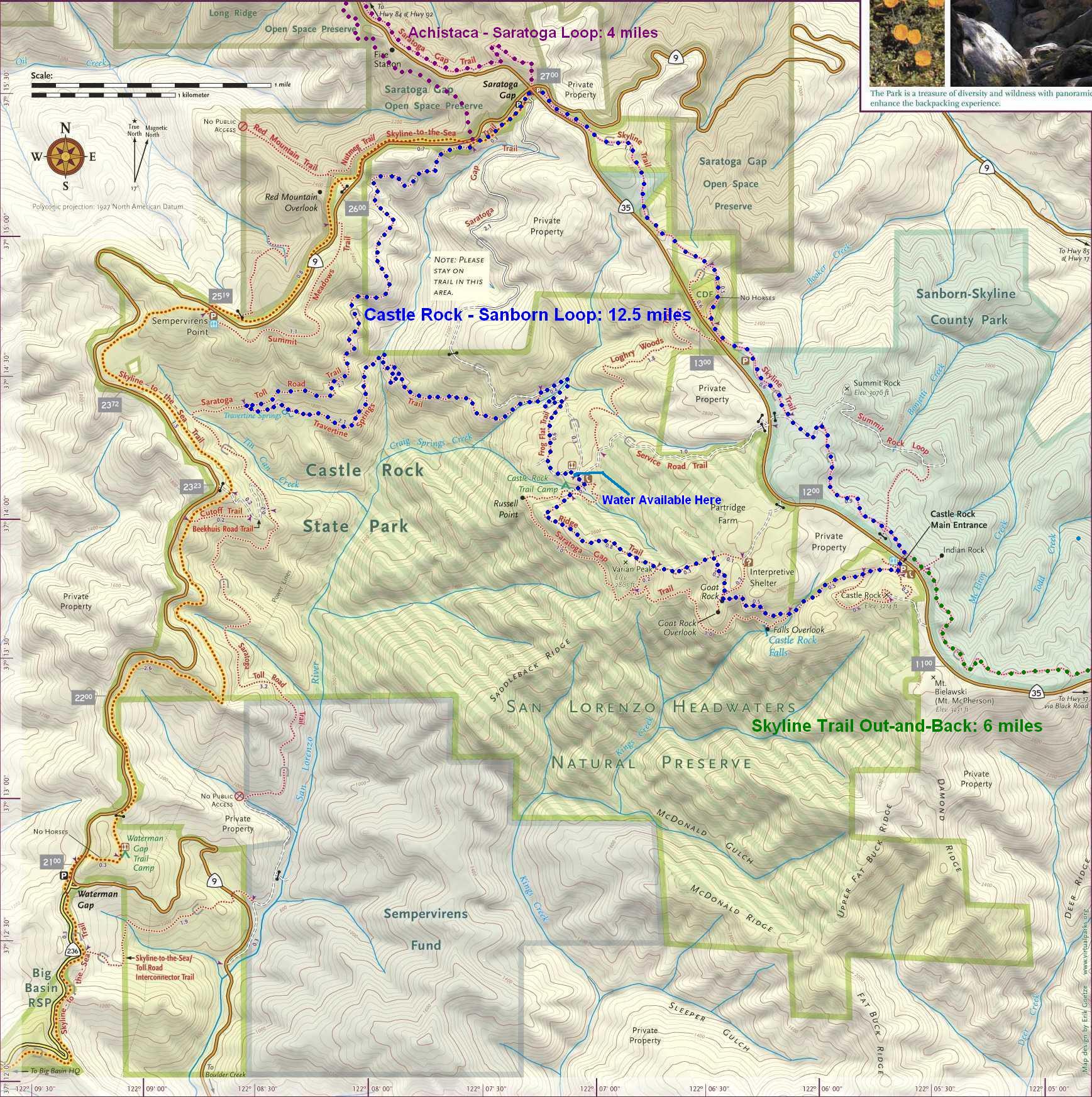 There appears to be several aesthetic extensions to the main loop to increase the mileage. The first add-on is the Achistaca/Saratoga Gap Trail Loop that extends north of Highway 9 to Long Ridge Open Space and adds 3.7 miles. When you reach the Skyline to the Sea Trail 0.3 miles from Saratoga Gap, turn left and cross Highway 9. On the other side is the Achistaca Trail which goes to Long Ridge in 1.7 miles. From here, cross Skyline Blvd. and take the Saratoga Gap Trail back to Saratoga Gap in 2 miles. The second extension is a 6 mile out-and-back along the Skyline Trail past the Main Castle Rock State Park entrance. The trail continues for another three miles to Sunnyvale Mountain which also marks the end of the currently completed segment of the Bay Area Ridge Trail. Finally, one could also incorporate the Skyline to Sea Trail by turning left on the Saratoga Toll Road Trail at the Travertine Springs Junction (instead of right) and linking up using either the Beekhuis Road or the Interconnector Trail to Waterman Gap.