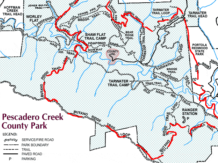 Pescadero Creek runs through a deep, shady canyon guarded by Butano Ridge, an aesthetic mountain that is over 15 miles long and rises over 2,200 feet. The snake-like shape of the ridgeline is unmistakable from Skyline Ridge and Long Ridge. The impressive relief in the area results in copious rainfall and an extremely lush environment where redwoods grow like weeds. The forests near Pescadero Creek are mature with some old growth, but the slopes of Butano Ridge have been logged more recently. Fortunately, the area is so conducive to growth that the redwoods have made a remarkably fast comeback. While some canyons have a dark, bland look characteristic of younger redwood forest, other parts are extremely pleasant. Aside from some stumps and lack of old growth, there is no longer any evidence of the logging operations and the Butano Ridge/Pescadero area looks like a carpet of green (as it should!). The north side of Pescadero Creek is also hilly with several redwood-filled canyons including Tarwater Creek and Towne Creek.