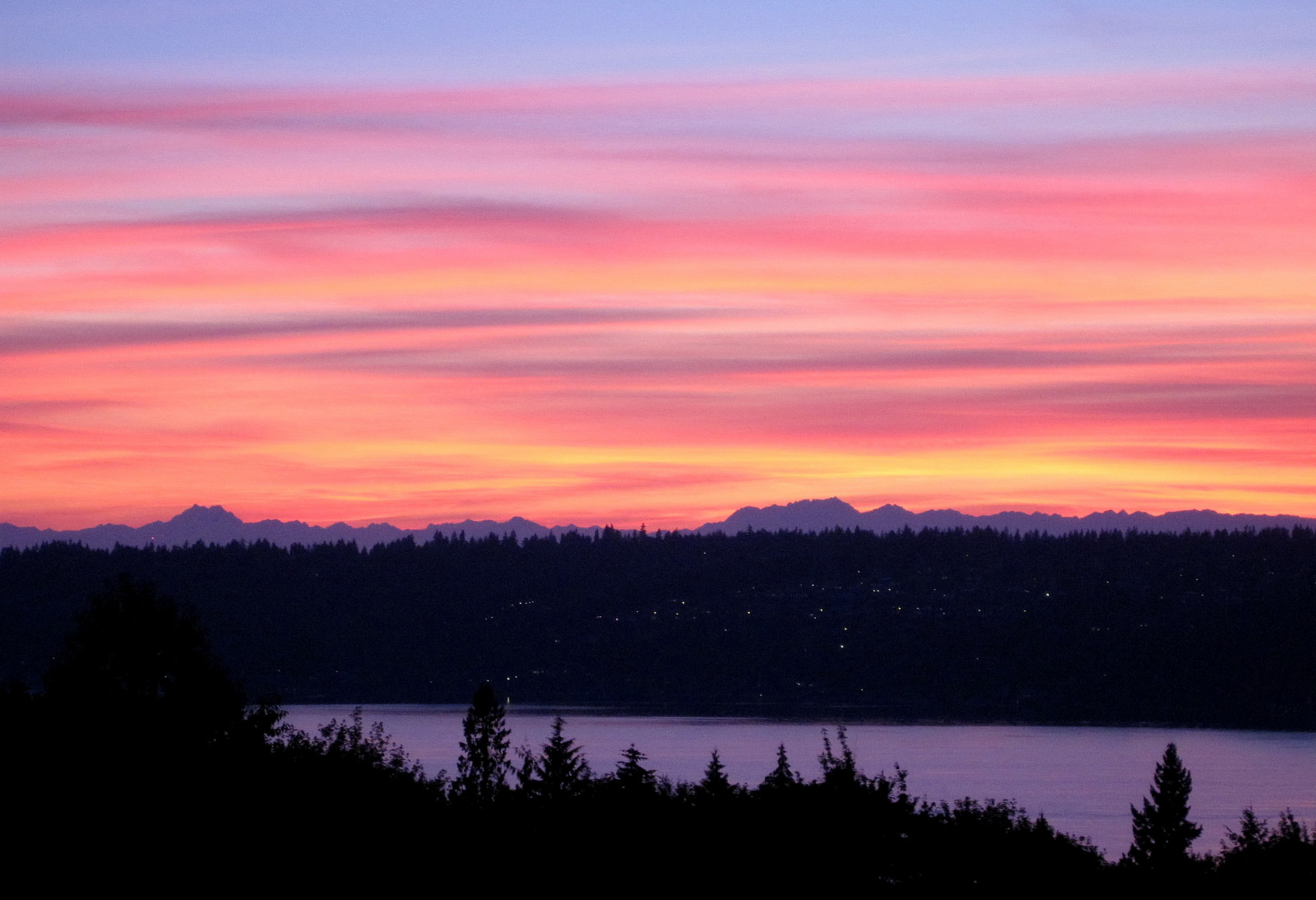 I thought the sunset from August 1st was great, but the light show on August 14th was even better! No smoke this time, just an idyllic uniform layer of high clouds producing an intricate pallete of colors – yellow, orange, pink, red, purple.  Amazing! Click image for larger versions.