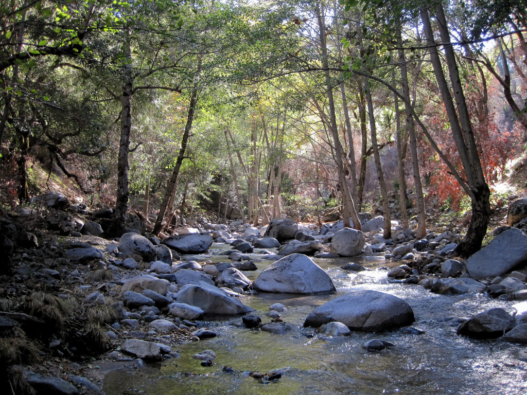 At Church Divide, we turned onto the Carmel River trail and soon after descending from the pass we found the headwaters of the Carmel River. A trickle quickly grew into a stream and by the time we reached lovely Pine Valley, the stream was flowing nicely. The fall colors in this section were gorgeous with maples and sycamores displaying bright orange and yellow leaves. This area is also heavily populated with madrones, which are adorned with so much red fruit that the trees appear red from a distance. At Pine Valley, we stopped for tea at Jack English’s cabin. Jack English is 90 years old and has lived in relative isolation in Pine Valley for over 35 years. Supplies and food are brought to him via horseback. It was great to meet Jack and hear about his experiences and history of the region.