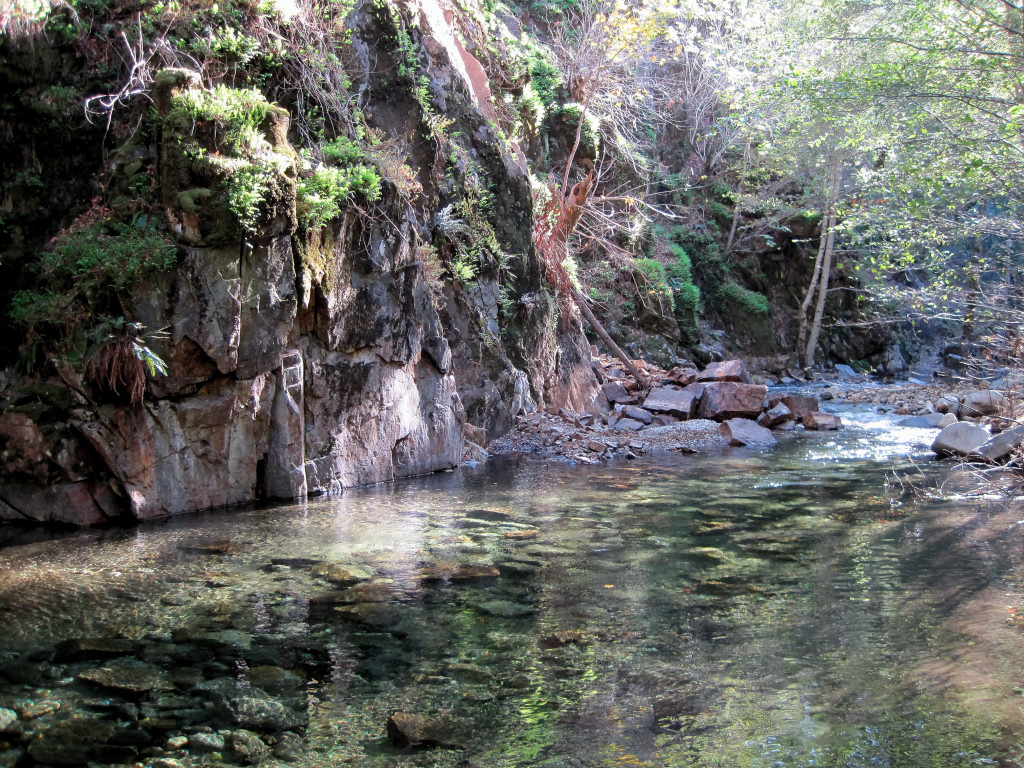 After Pine Valley, we temporarily left the Carmel River and climbed up to another pass to enter Hiding Canyon. Hiding Canyon was very brushy with numerous blowdowns and other impediments obscuring the trail for a couple miles. A small climb out of hiding canyon signaled the end of the brush and we were treated to great views of the upper Carmel River canyon. Next, we descended down the Carmel River and began over two dozen river crossings. These crossings are necessary because travel on either side becomes blocked by rock walls that descend all the way into the river. The trail connecting the river crossings is nothing more than a use path and was often nonexistent due to brush and dirt slides, but the objective is simple, follow the river downstream.