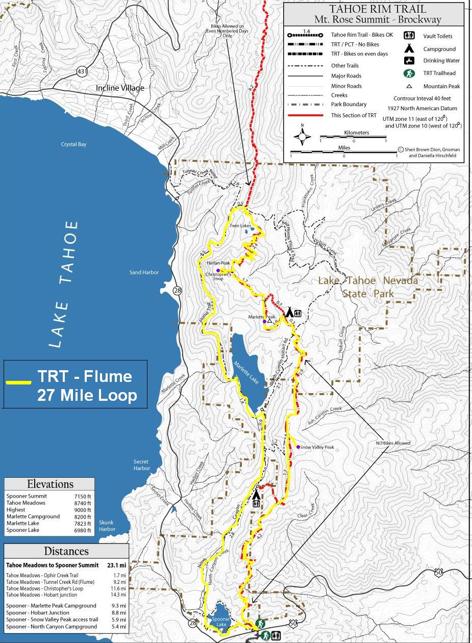 With the entire High Sierra to the south enveloped in numerous thunderstorms all weekend (even some snow at the highest peaks), I thought it would be a great opportunity to visit the trails of Lake Tahoe. Specifically, a 27+ mile loop on the east shore of Lake Tahoe including a long stretch along the Tahoe Rim Trail and the famous Flume Trail. The trails along the entire route are extremely well graded and relatively non-technical for much faster running compared to the trails in the more rugged High Sierra to the south. Highlights included Snow Valley Peak, Marlette Peak, Christopher’s Loop point, and the famous Flume. Many more photos here and here. Also, I drew the route on the map.